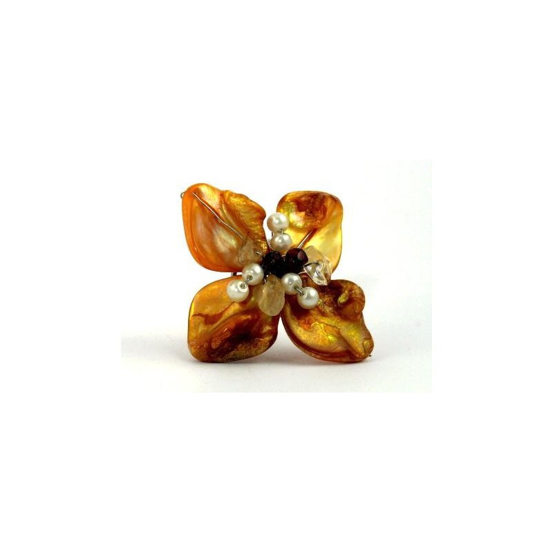 Prsten ruční výroby zdobený přírodními kamínky, perličkami, korálky a perletí. Velikost květu 4 cm.